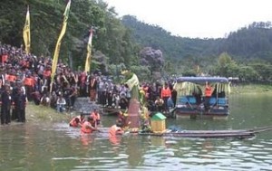 GIFT FOR THE INVISIBLE: Villagers conduct the Larung Sesaji, an offering ritual, at the Ngebel dam in Ponorogo, East Java, on Monday to commemorate the Islamic New Year. The giant cone of rice, the main offering, was carried on a raft to the middle of the dam before being thrown into the water. (JP/ID Nugroho)