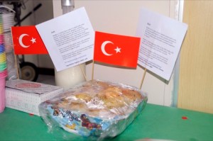 Ve sonra farklı kültürlerin yiyebileceğimiz en güzel, hepsi ev yapımı yiyeceklerinin tadına bakmak için parti odasına gittik. Sanırım en milliyetçi sunum benimkiydi ama elilmde değil. Türk menüsü ayran, patatesli minik gül börekleri ve sakızlı lokumdan ibaretti.