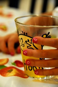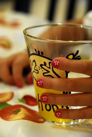 Anne kız kuaför keyfi ve çiçekli, ışıltılı minik tırnaklar.