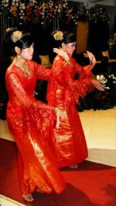 Neyse, gün geldi, giyindim gittim. Mekan gerçekten cami bünyesinde ancak, ayrı bir düğün salonu tarzı bir yer. Gündüz camide , sadece aile ve akrabalarla birlikte dini ve resmi nikah töreni yapılmış. Bu törene ben davetli değildim ama çok geleneksel birşeymiş ve kız isteme, verme, evlendirme falan olayları temsili olarak canlandırılıyormuş. Akşam ise eş, dost yemekli bir kutlama için davet edilmiş. Bu arada düğün hazırlıkları sırasında aileler arasında biraz gerilim yaşanmıştı, çünkü arkadaşım Medan’lı, kız tarafı ise Solo’lu (Orta Java). Düğün prosedürü, giysiler, falan tamamen farklıymış. Sonunda gelin baskın çıktı sanırım, Java usulü yapmaya karar verdiler. Yani bu anlatacaklarım Orta Java düğünü. Diğer bölgelerde giysiler ve tören daha farklı olabiliyormuş.
