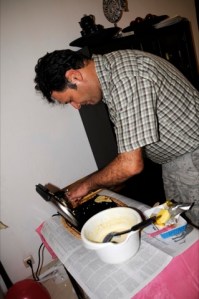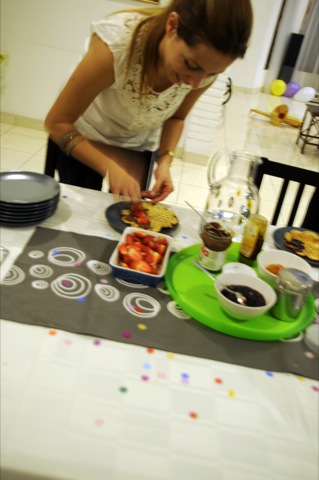 Tatlida cikolata fonduden vazgecip, Tunc’un spesiyali waffle olayina girdik. Iyi ki de oyle yapmisiz, cok eglenceli oldu. Bir gece onceden tamamen goz karariyla, tadina falan bakarak gayet iptidai bir sekilde hamurunu hazirlayan kocam, benim yemek yapmaya dair tum teorik bilgilerimi altust ederek, harika lezzette waffle’lar yapti bize (DYYYSOKKO adina bir dakikalik protesto durusunda bulundum tabii ki). Mis gibi kokular eve yayildikca bastan cikip siraya girdik. Sonra da bilimum kalorili seylerle uzerini doldurup mideye indirdik.