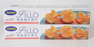 3) Phyllo dough: Bildigimiz baklava yufkasi bu. Donmus, dikdortgen yapraklar halinde cikiyor kutudan. Baklava yufkasini nasil kullaniyorsaniz aynen oyle kullanabilirsiniz. Gayet basarili. Bu da donmus urunler reyonunda, ancak her markette yok. Ranch, KemChicks gibi sosyete marketlerinde bulabilirsiniz. Asagidaki paket: